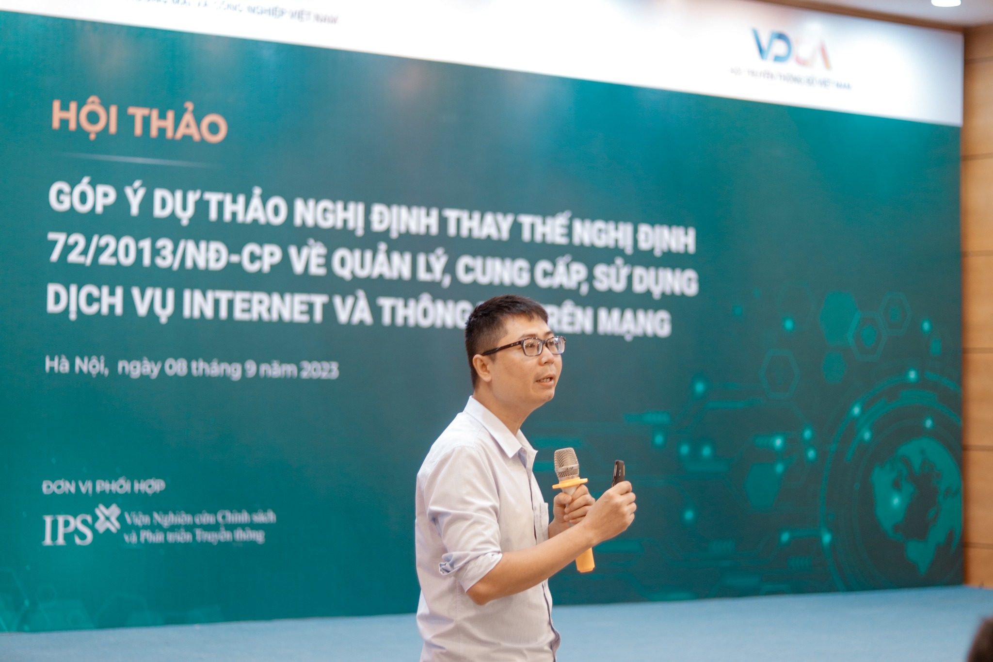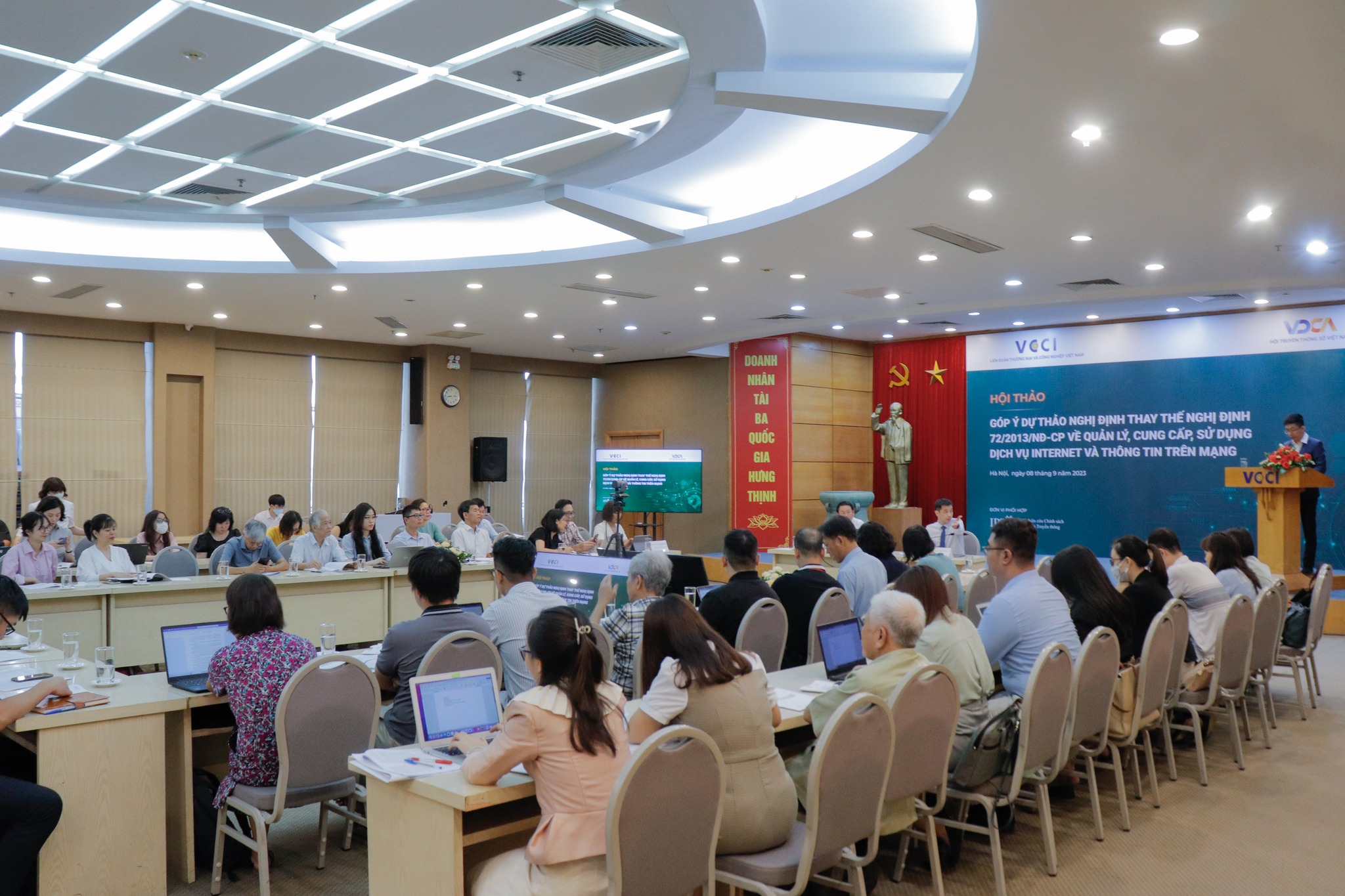 Sáng ngày 08/9, Liên đoàn Thương mại và Công nghiệp Việt Nam (VCCI) cùng Hội Truyền thông số Việt Nam (VDCA), với sự phối hợp của Viện Nghiên cứu Chính sách và Phát triển Truyền thông (IPS) đã tổ chức Hội thảo “Góp ý hoàn thiện Dự thảo Nghị định thay thế Nghị định 72/2013/NĐ-CP về quản lý, cung cấp, sử dụng dịch vụ Internet và thông tin trên mạng”.