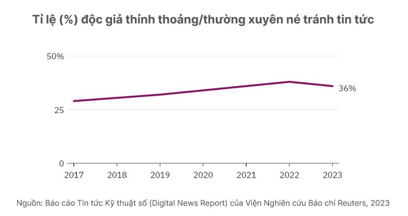 Cũng trong báo cáo nói trên, Viện Nghiên cứu Báo chí Reuters tiếp tục nhấn mạnh một hiện tượng rất đáng quan ngại với các cơ quan báo chí là né tránh tin tức, khi có 36% độc giả trả lời rằng họ thỉnh thoảng hoặc thường xuyên né tránh tin tức. Hiện tượng này có xu hướng gia tăng liên tục trong khoảng thời gian từ năm 2017 đến 2022, trong đó một số nguyên nhân được chỉ ra là việc độc giả quá mệt mỏi với lượng tin tức khổng lồ, tin tức không đáng tin cậy hoặc có thiên kiến, hay tin tức tác động tiêu cực đến cảm xúc.