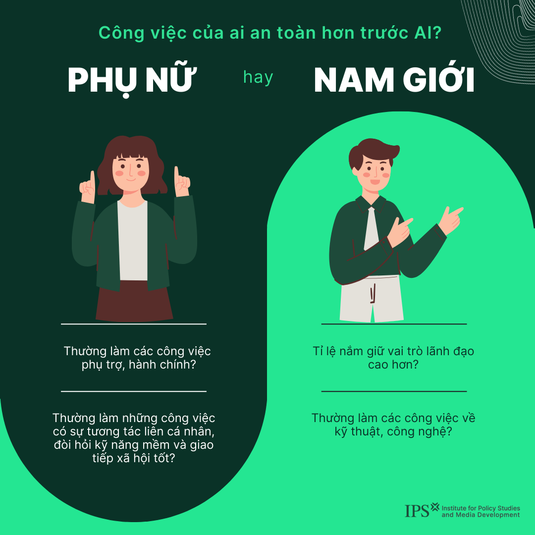 Đa số các nghiên cứu cho rằng tỉ lệ phụ nữ làm việc trong các công việc có tính chất phụ trợ, hành chính hay dịch vụ - những ngành có tiềm năng tự động hóa lớn - thường cao hơn nhiều tỉ lệ nam giới, khiến phụ nữ dễ bị thay thế bởi AI hơn. Kể cả trong những công việc đòi hỏi nhiều kỹ năng như quản lý con người, áp dụng chuyên môn, tương tác xã hội hay đánh giá theo ngữ cảnh mà có ít nguy cơ bị tự động hóa hơn, phụ nữ vẫn có thể chịu thiệt thòi do ít được nắm giữ những vị trí lãnh đạo. Gallego và cộng sự (2019) lấy ví dụ trong lĩnh vực dịch vụ tài chính, phụ nữ chiếm gần 50% tổng lực lượng lao động nhưng chỉ nắm giữ 25% vị trí quản lý cấp cao. Nếu các vị trí quản lý được "an toàn” hơn trước những cú sốc của tự động hóa, đồng thời các công việc văn thư và hành chính phải đối mặt với nhiều rủi ro hơn, thì phụ nữ trong lĩnh vực dịch vụ tài chính nhìn chung vẫn sẽ bị tác động tiêu cực hơn bởi tự động hóa dựa trên AI [1].