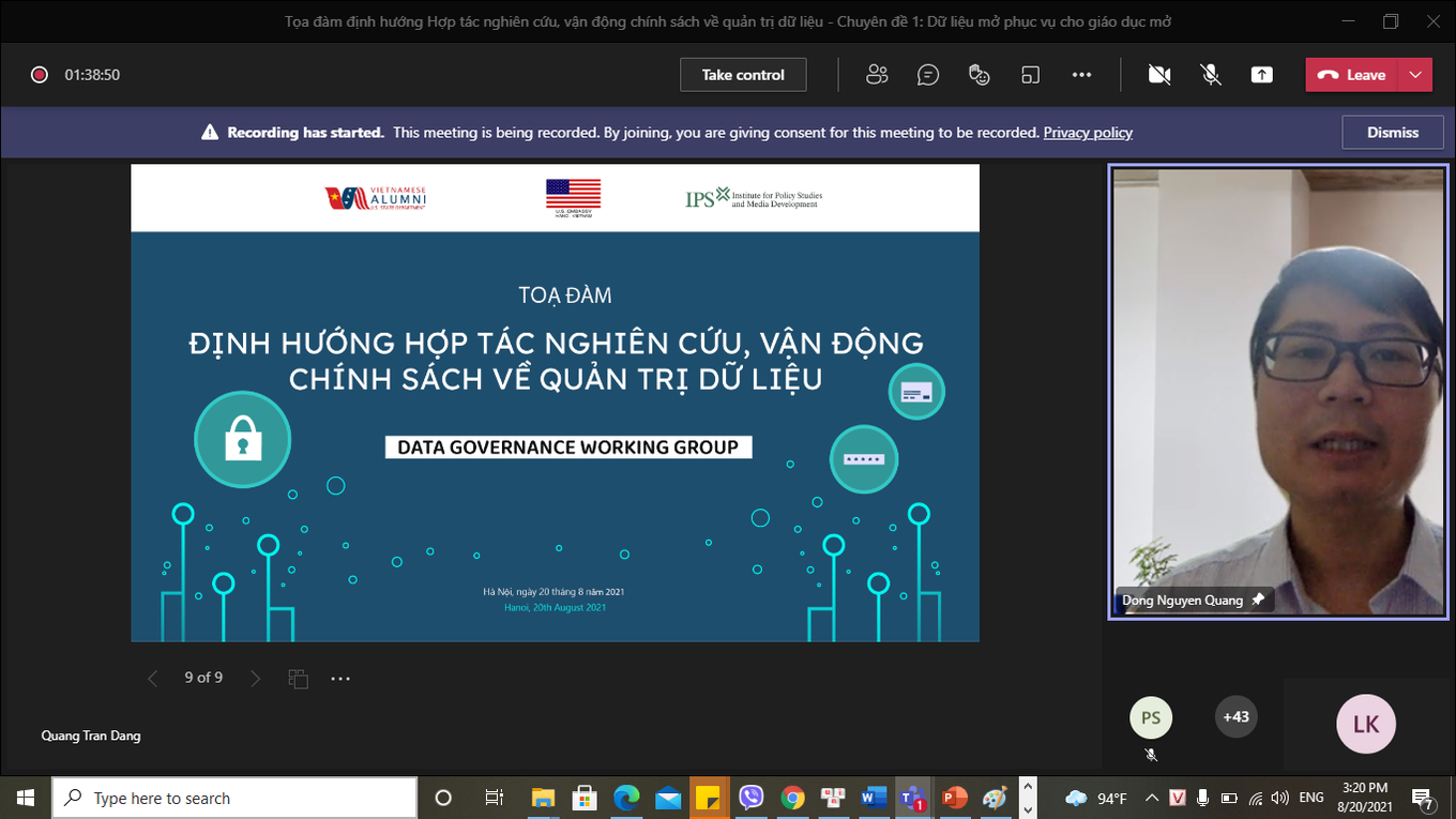 - Thứ nhất, ông Nguyễn Quang Đồng - Viện trưởng Viện IPS trình bày tổng quan các vấn đề chính sách về quản trị dữ liệu ở Việt Nam. Các đại biểu tham gia góp ý, chia sẻ quan điểm.