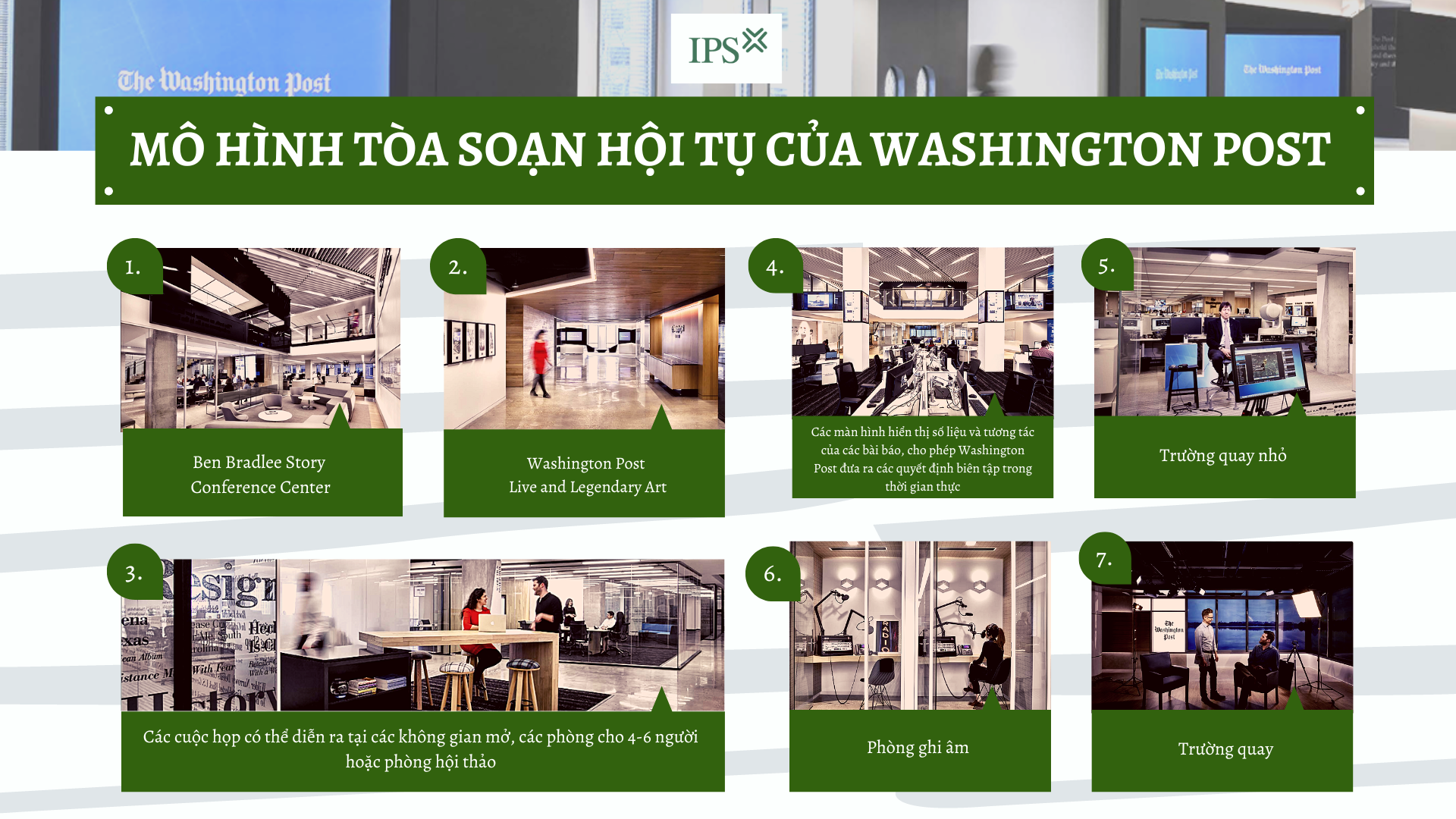 Với định hướng xây dựng các sản phẩm video, ngoài trường quay truyền thống ở tầng 07, Washington Post đã xây dựng thêm ba phòng quay trực tiếp nhỏ hơn cho các sản phẩm video ngắn và TikTok.